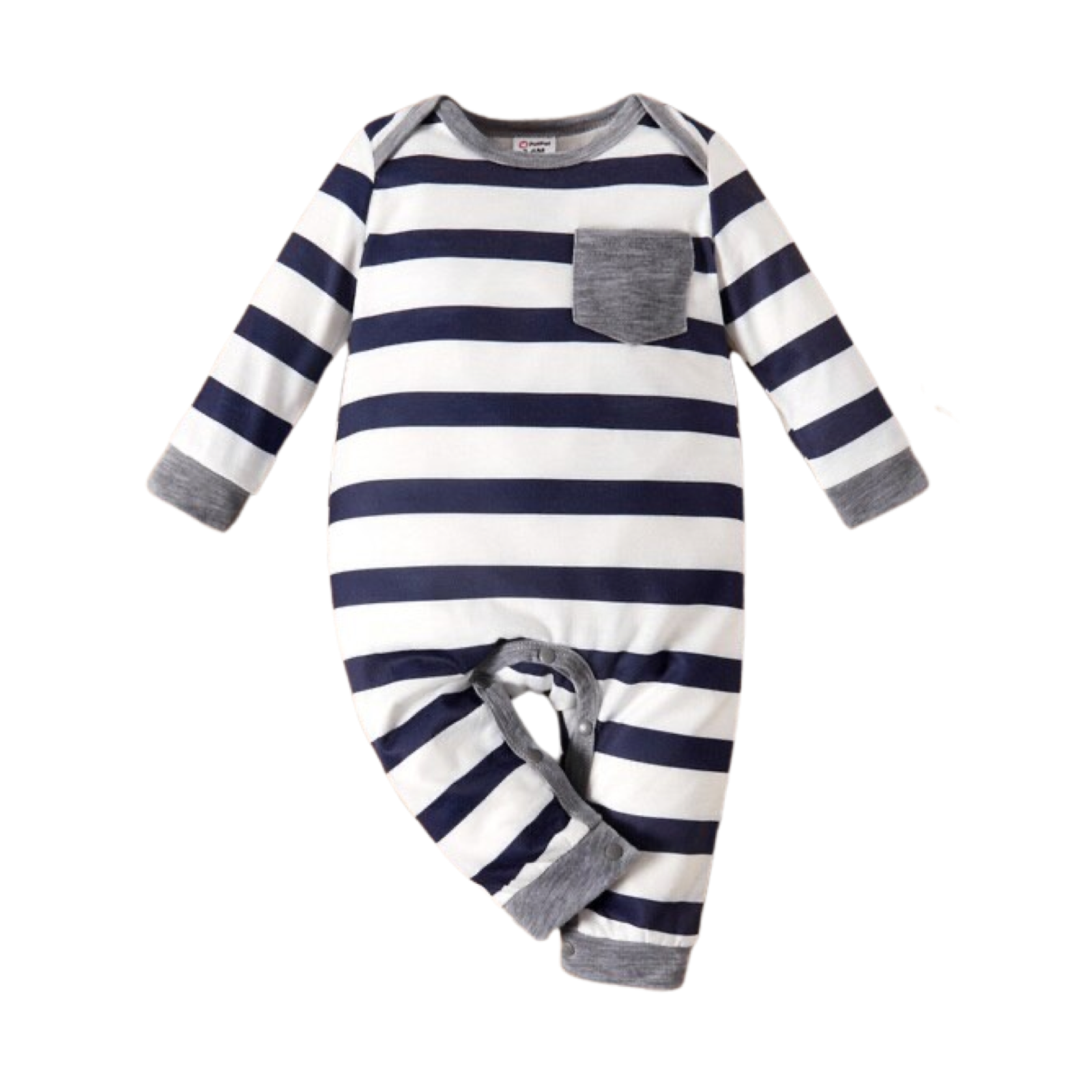 Pijama a rayas azules y bolsillo gris. Sin piecitos.