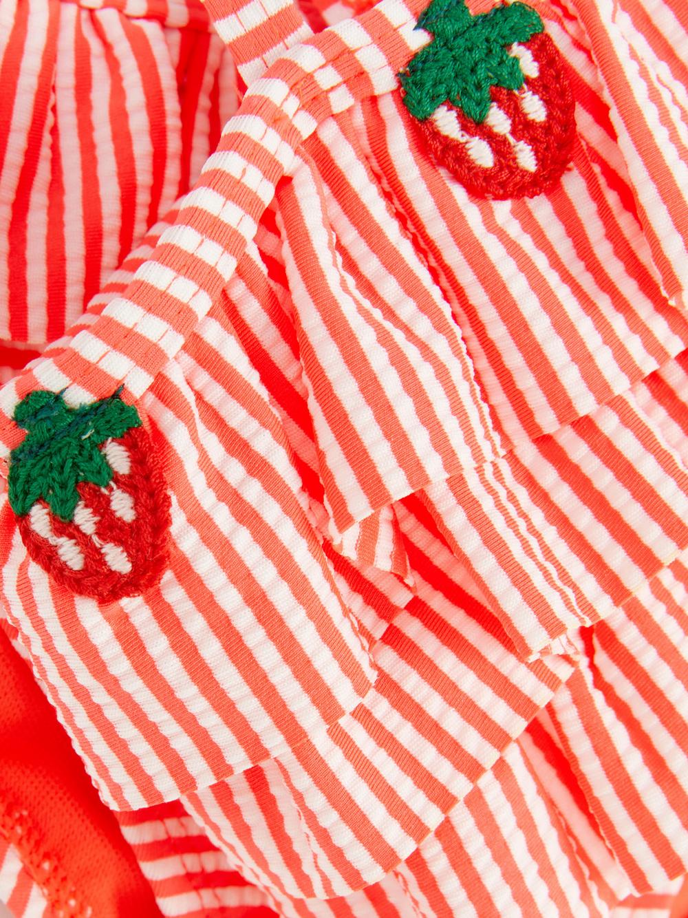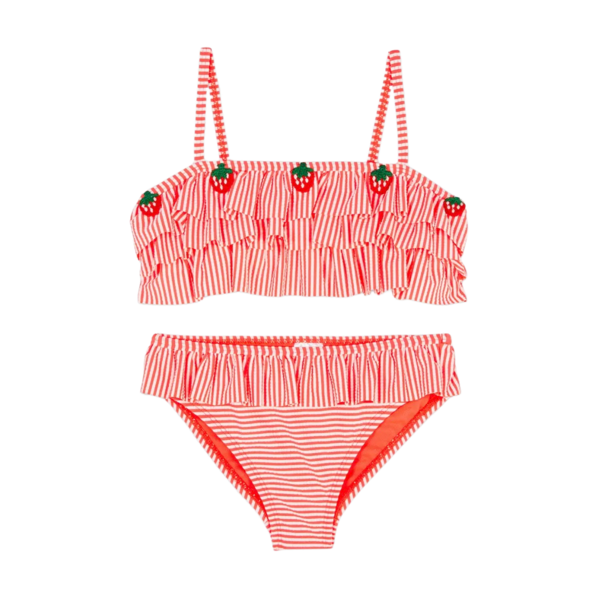 Bikini con fresitas bordadas y vuelitos arriba y abajo. Este dulce bikini no puede faltar en su maleta para las vacaciones.